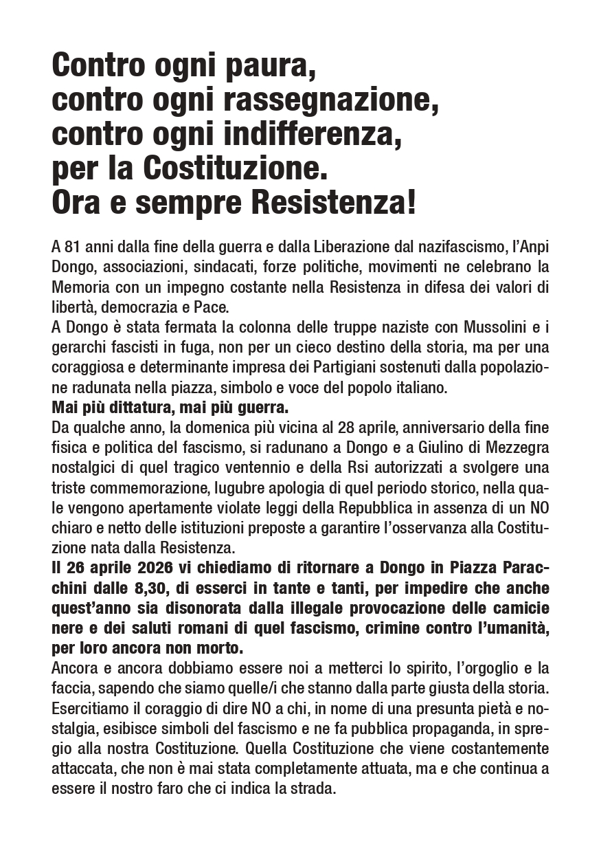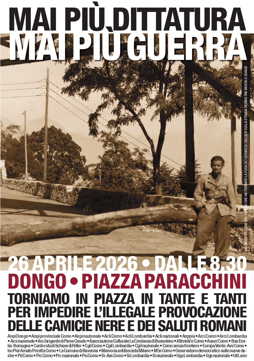 Il 26 aprile 2026, per una volta ancora, realtà politiche, sindacali, associative, culturali saranno presenti per tutta la mattinata, a Dongo in piazza Paracchini, per rendere evidente che 81 anni fa il fascismo finiva e che le “commemorazioni” nostalgiche e antidemocratiche degli ultimi epigoni della dittatura e della violenza fascista e nazista non hanno alcuna ragione di esistere".